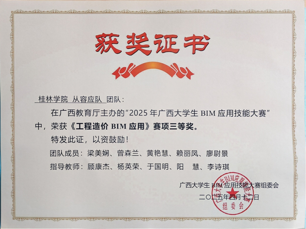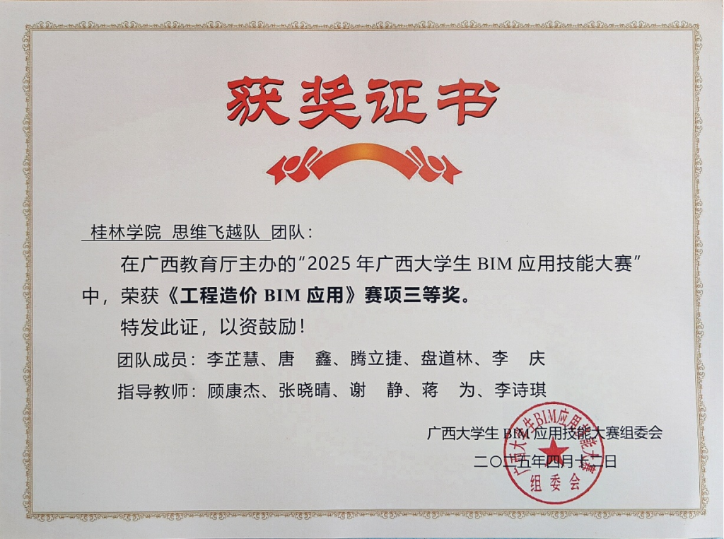 日前,由广西壮族自治区教育厅公布的“2025年广西大学生BIM应用技能大赛暨第十六届全国高等院校学生数字城市创新技术与应用大赛”获奖名单出炉。我校城市设计学院工程造价与城乡规划专业的参赛团队在比赛中表现优异,由顾康杰、杨英荣等教师指导的两个参赛团队,凭借扎实的专业功底与创新应用能力,在《工程造价BIM应用》赛项中双双荣获三等奖。