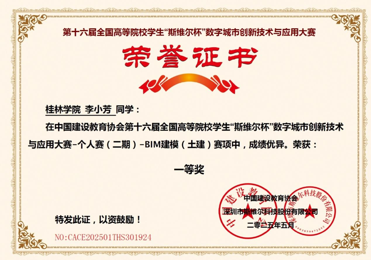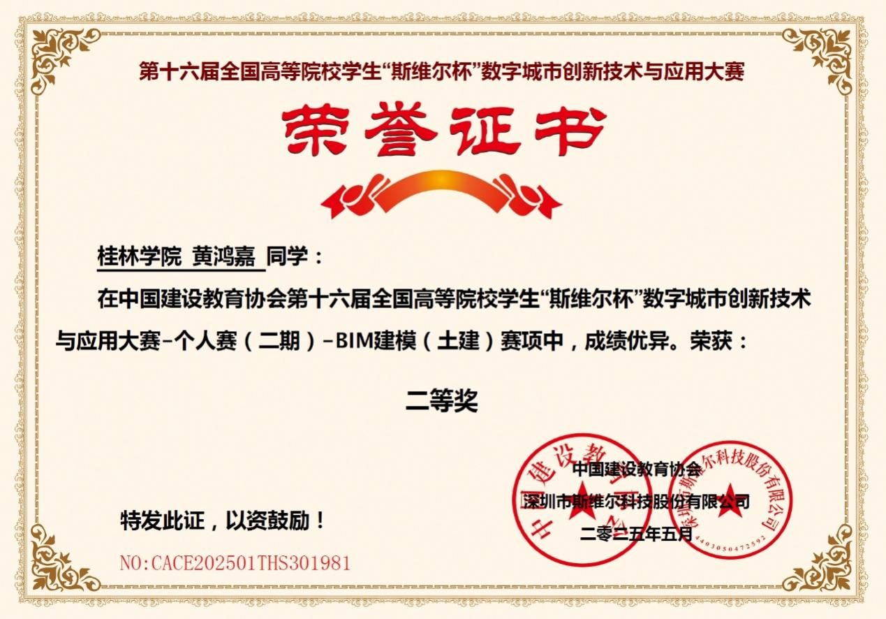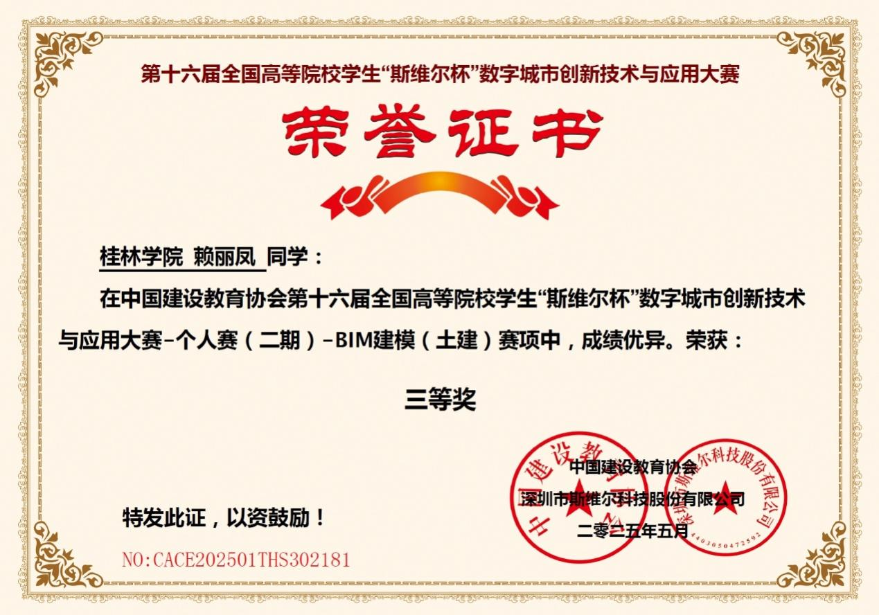 日前,由中国建设教育协会主办的第十六届“斯维尔杯”数字城市创新技术与应用大赛BIM建模(第二期)个人赛圆满收官。我校工程造价专业参赛选手在本次赛事中表现突出,共斩获一等奖3项、二等奖6项、三等奖6项,获奖总数位居全区参赛高校前列。