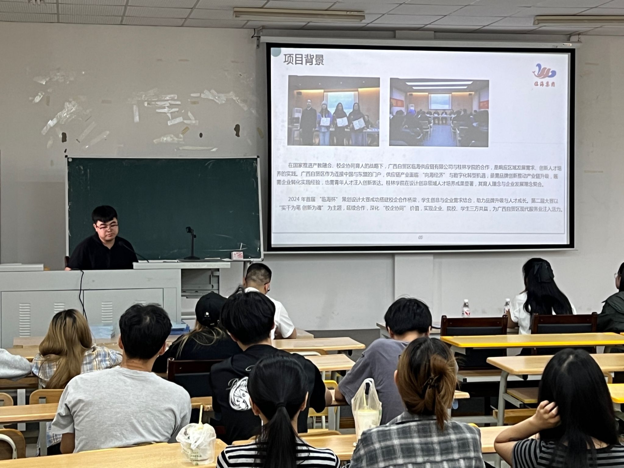 9月24日上午,广西自贸区临海供应链有限公司业务经理黄铭一行到访城市设计学院,就第二届“临海杯”品牌策划设计大赛进行宣讲。宣讲会在嘉善楼132教室开展,学院视觉传达专业教师代表以及学生代表共40多人参会。