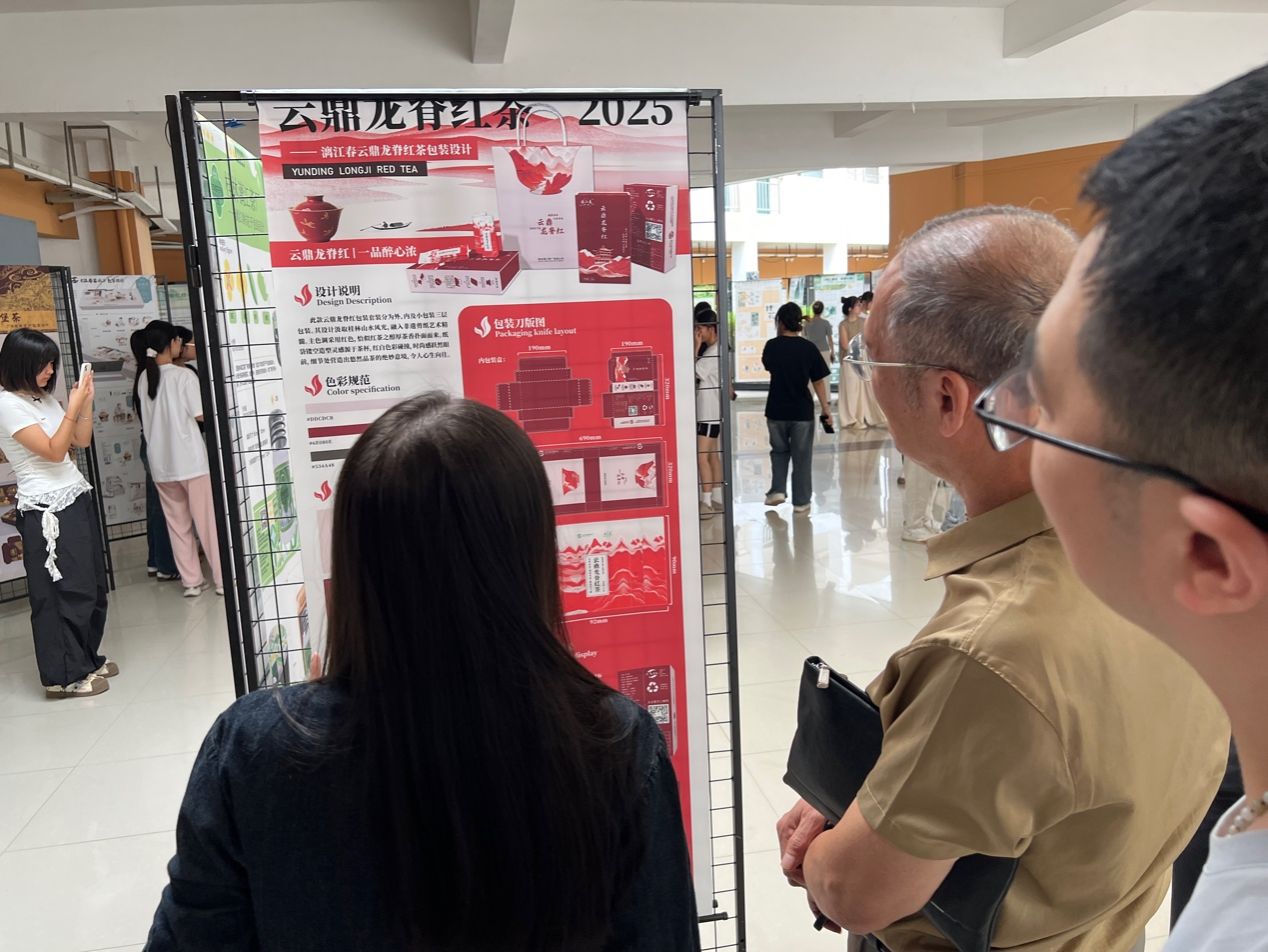 会上,学院党总支负责人在讲话中向与会人员介绍了此次竞赛情况,并谈到,城市设计学院作为践行学校“应用型、地方性”办学理念的重要力量,始终以“设计服务地方、创意赋能产业”为定位,此次竞赛通过将课程教学与企业包装设计深度融合,让设计作品更贴合市场需求,为漓江茶厂品牌发展注入了创意活力。