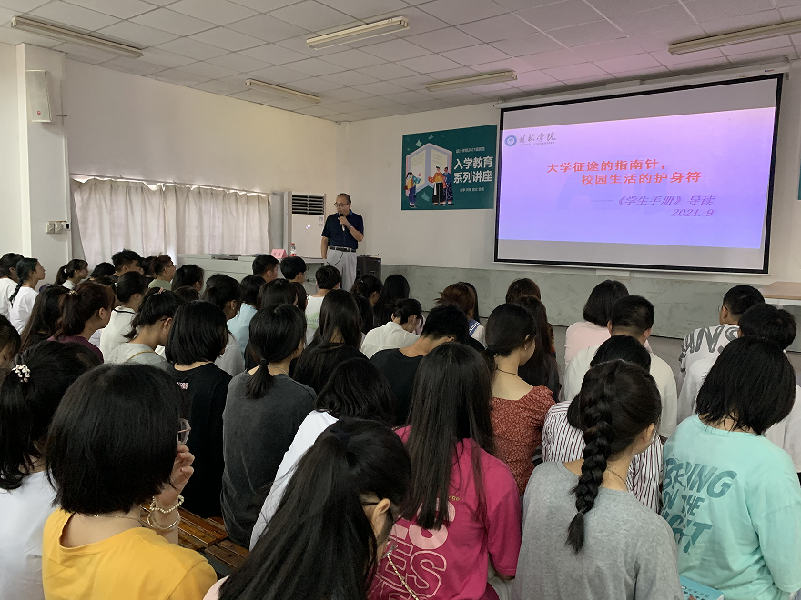 9月18日上午,设计学院在嘉善楼132教室举行《桂林学院学生手册》解读讲座,本次讲座由教育与音乐学院党总支书记周杰老师主讲,全体2021级新生参与了此次活动。