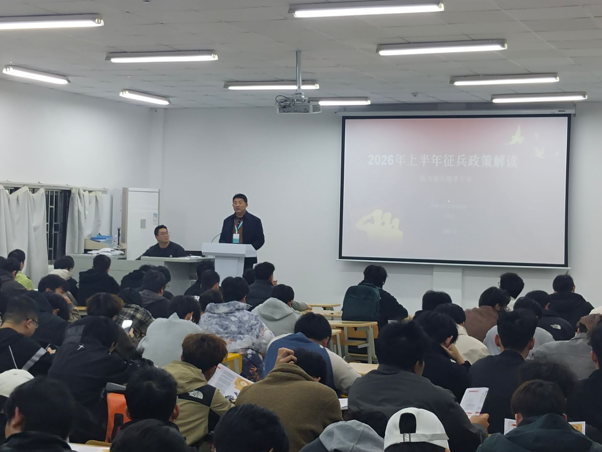会上,学校党委武装部王晓忠围绕2026年上半年征兵政策进行了系统解读,重点介绍了网上报名新增的“政考信息”和“初检初核”项目填写要求,明确了报名时间、征集对象、体检注意事项及政治考核流程等内容。针对毕业生关心的年龄条件、军兵种选择、直招军士政策以及桂林市入伍鼓励金等激励措施,宣讲人也作了详细说明。