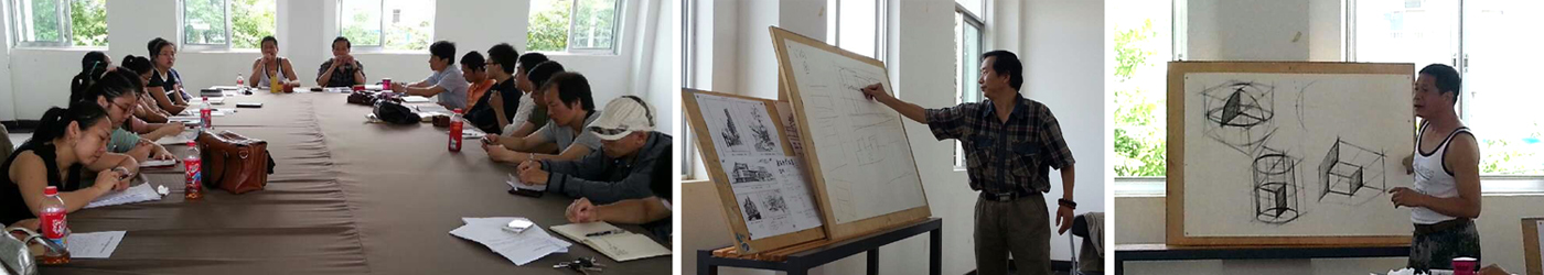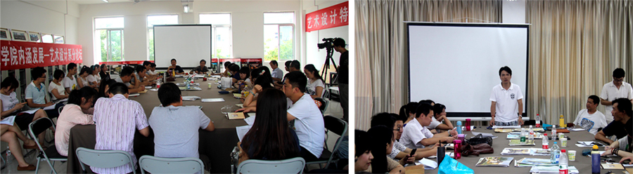 流程:第一环节,由环境艺术设计和视觉传达设计两个专业的教学团队围绕“提升专业基本技能,奠定专业发展基础”这一主题,分别阐述在各自专业的课堂教学中,就如何将造型与色彩的基础课程融入到专业课程的学习中,从而增强学生的专业技能,提升他们的社会竞争力;第二环节,以专业课程为例,现场示范将基础课程技法运用于专业课程作业中;第三环节,老师们就教学过程中存在的课程设置、课程教学法等问题进行了交流。在活动过程中,刘林海副院长也和两个团队进行了交流和探讨,会场讨论气氛活泼、热烈。