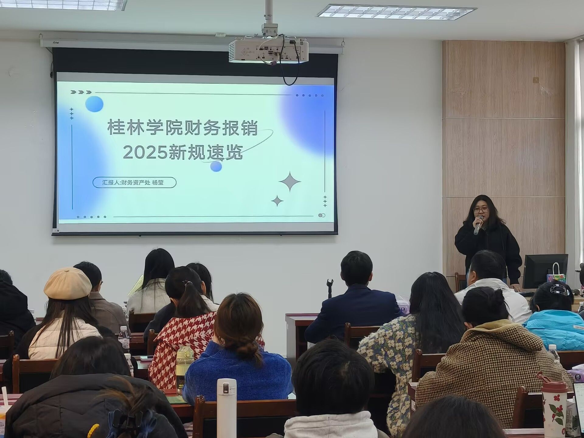 为及时传达学校最新财务管理政策,推动财务报销流程更规范、更高效、更便捷,2025年12月3日下午,桂林学院财务资产处在图书馆C馆三楼报告厅组织召开“财务报销2025新规”专题宣讲会。财务资产处杨莹老师担任主讲,各学院、部门约60名教职工参与学习。