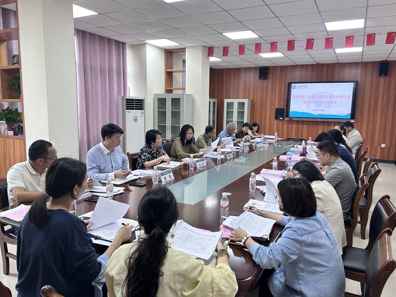 5月9日下午,校长杨树喆在知善楼8312会议室主持召开“规范民办高校办学行为专项行动”工作部署会。校领导唐文红、刘文革、杨庆庆、何玲、蒋毅,学校办公室/董事会秘书处、党委工作部、发展与质量评估处、教务与产教融合处、人力资源处(部)、学生事务处(部)、资产与设备管理处、财务处、图文信息中心、后勤保卫处等部门主要负责人参加了会议。