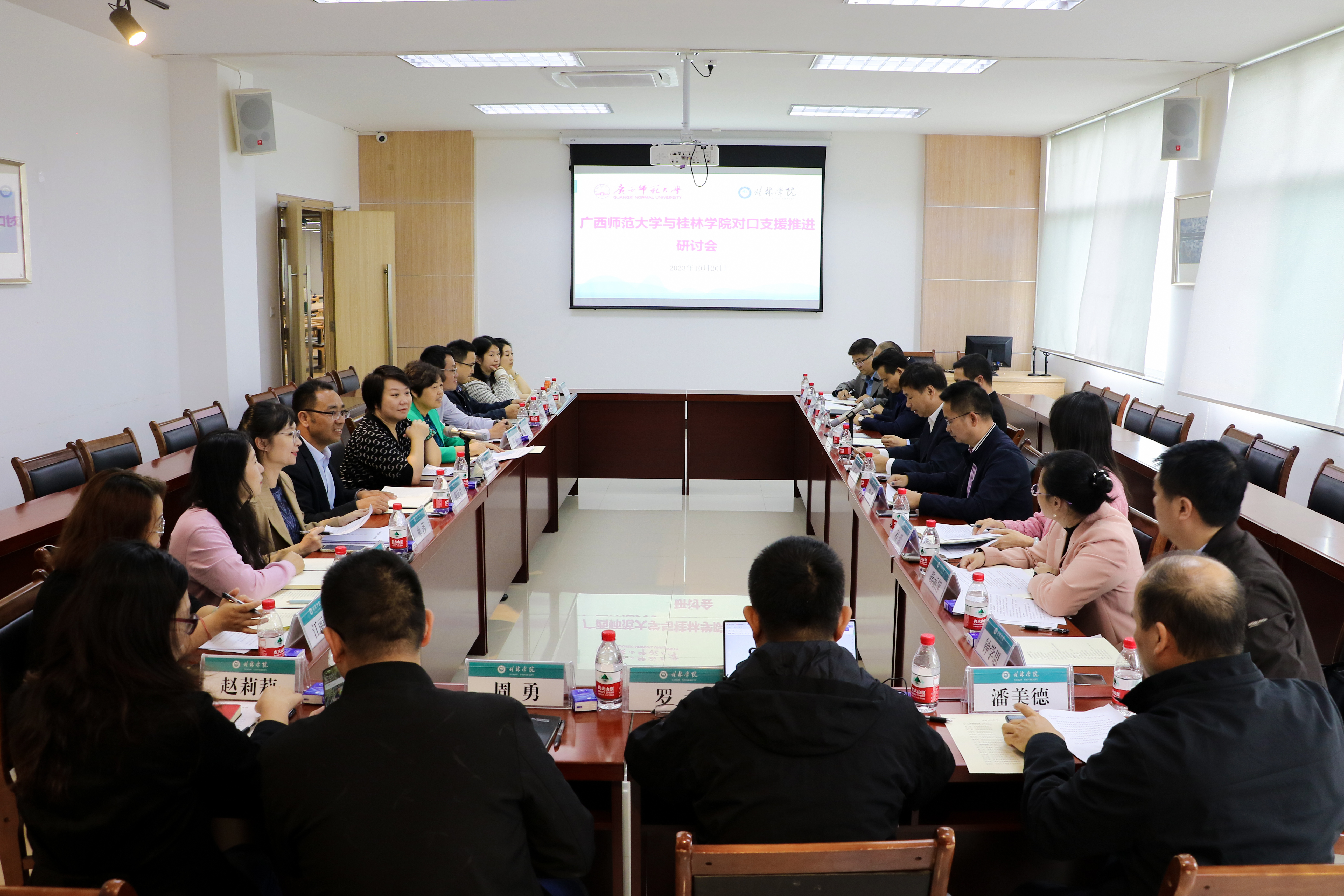 为贯彻落实自治区教育厅关于广西师范大学对口支援桂林学院的通知文件精神,继今年3月签订《广西师范大学与桂林1学院对口支援协议书(2023年—2025年)》和制定《2023年广西师范大学与桂林学院对口支(受)援工作任务清单》之后,10月20日上午,广西师范大学黄文韬副校长一行到我校开展对口支援推进研讨会,围绕广西师范大学与桂林学院对口支援工作的落实情况和明年的工作计划开展交流。