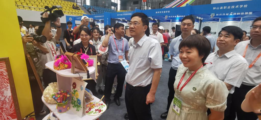 我校学前教育专业是广西民办高校优势特色专业和学校一流专业,学前教育专业结合办学定位及专业特色,依托自治区级课程思政示范课程《幼儿园手工制作》,精心策划筹备了“培根铸魂育新人,启智润心担使命”为主题的专业教育展示。展出了以传统手工艺、自制教玩具为主的学前教育专业美术类课程以及多门专业课程联合教学的实践作品,充分展示了学前教育专业技术技能服务和应用于幼儿教育、现代生活的成果。期间,联合国教科文组织曼谷多部门地区办事处代理主任汪利兵、自治区教育厅厅长刘友谊等领导嘉宾,来自印尼、马来西亚、新加坡、菲律宾、泰国等东盟国家高校的嘉宾,以及广西各兄弟院校领导来到设在广西建设职业技术学院体育馆的桂林学院技术技能服务现代生活展位观展和指导。精美的剪纸、刻纸、衍纸、竹编、脸谱、醒狮等极具中华优秀传统文化及民族文化特色的作品吸引了诸多外宾驻足欣赏和参与体验。杨树喆、杨庆庆,看望参加联展活动的全体师生,并观看了我校舞蹈学专业师生创作的《漓江春早》舞台展演。