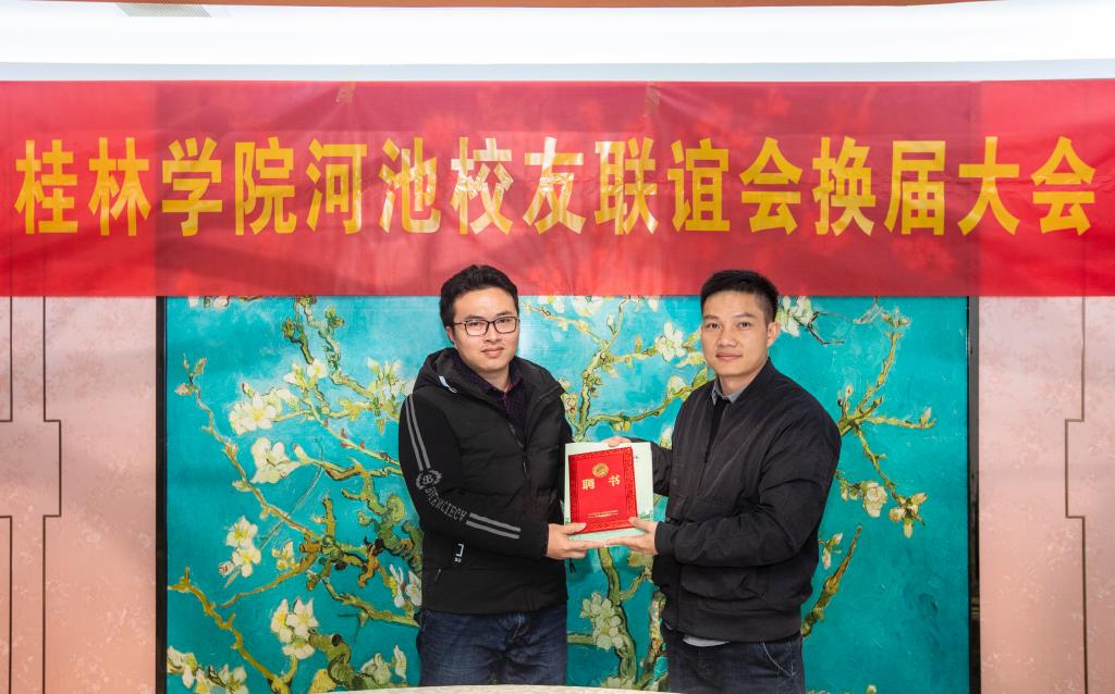 会上,机关党总支书记、后勤保卫处处长李久华,语言文学学院党总支书记江仿,后勤保卫处副处长付健分别向河池校友联谊会新一届理事会成员颁发聘书。会长由韩鑫担任,秘书长由罗懿担任,副会长由张登飞担任。