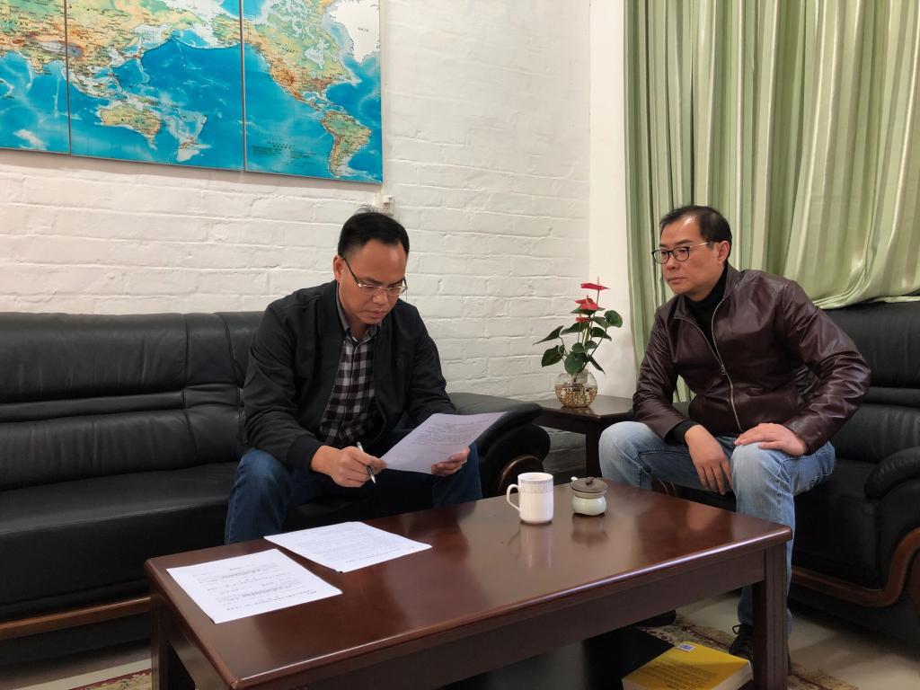 我校党委副书记、纪委书记、副校长邓志平和国际交流中心主任凌忠认真学习出访的材料