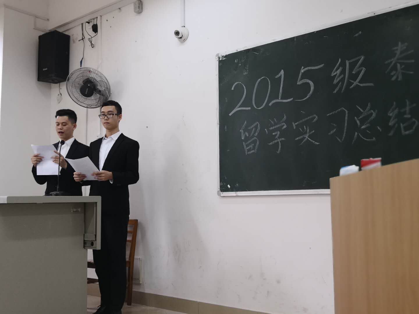 10月18日下午, 我校15级泰语专业学生在外语系召开留学实习总结大会。外语系主任何玲、国际交流中心主任凌忠参加了会议。
