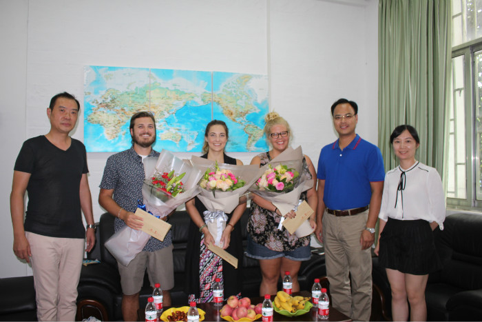 今年的教师节,我校副校长,党委书记邓志平,工会主席廖莎一行来到了国际交流中心庆祝教师节,慰问三位外教,感谢外教们在过去一年的辛勤工作以及高度认可外教们在教学上取得的成绩。最后邓副校长为外教们送上鲜花和节日礼物,并留下合影。
