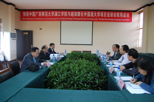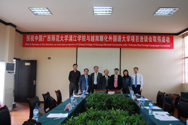 为了扩大漓江学院的办学影响力,继续推进学院面向东盟经济区域的人才培养战略,2011年5月14日,越南顺化外国语大学校长陈文福、中文系主任廖永勇和国际交流处副处长赖国禄一行三人到访桂林,并顺利与我院续签合作协议。