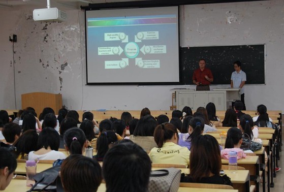 4月26日17:10分,我院国际学院院长Rick R. Gregory博士与我院国际交流中心副主任凌忠老师一起,在002教室向外语系09级英语专业全体同学召开了美国大学硕士直通车项目招生宣讲会议。