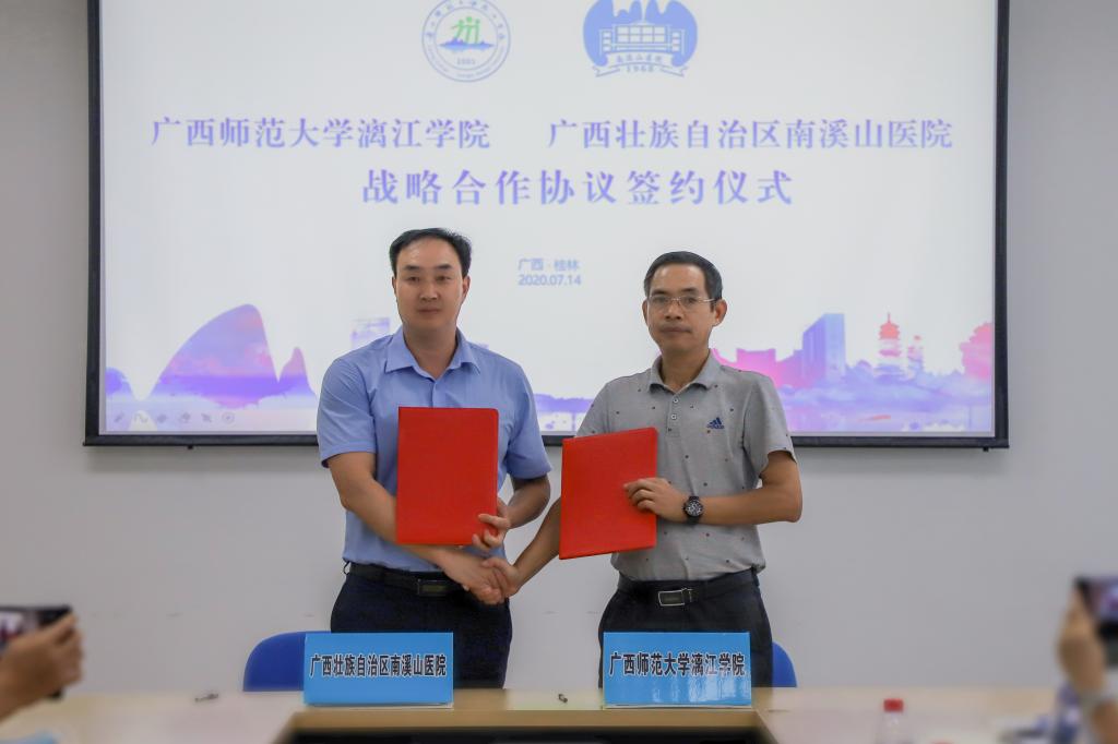 7月14日下午,我校与广西壮族自治区南溪山医院签订战略合作协议。自治南溪山医院党委书记戴前富、党委副书记、院长刘宇军、纪委书记张超群、副院长刘慧华、我校董事、党委副书记、校长杨树喆、学校董事、校党委书记唐文红、党委副书记、纪委书记、副校长邓志平、总会计师、副校长祝芸芸、董事、副校长刘文革、副校长、校工会主席杨庆庆出席签约仪式。签约仪式由学校董事、党委书记唐文红主持仪式。