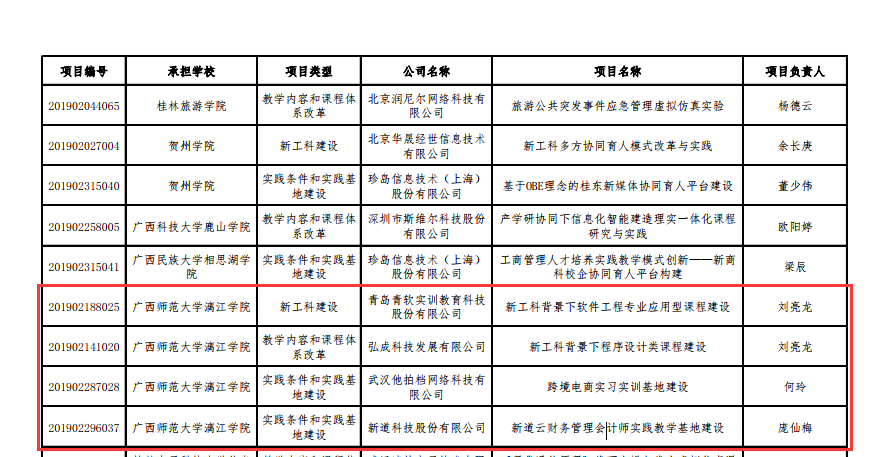 6月11 日,教育部高等教育司公布的 《关于公布2019年第二批产学合作协同育人项目立项名单的通知》(教高司函〔2020〕6号),全国900多所高校入选,我校《新工科背景下软件工程专业应用型课程建设》、《新工科背景下程序设计类课程建设》、《跨境电商实习实训基地建设》、《新道云财务管理会计师实践教学基地建设》等4个项目获立项。