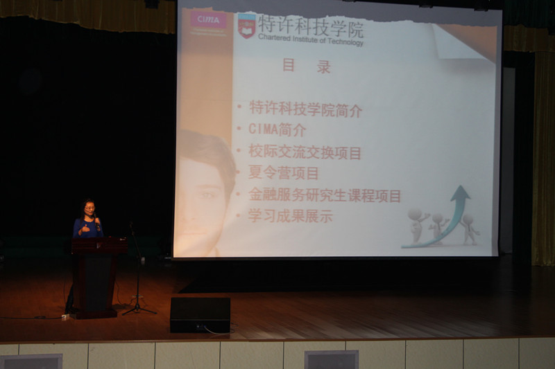 宣讲会由管理系党总支书记蒋毅老师主持。国际交流中心凌忠主任首先用双语为到场的同学做了精彩的开场,鼓励同学们大胆走出国门,提高自己的专业能力。随后,特许科技学院的杨老师从学院简介、CIMA简介、校际交流项目、夏令营项目、金融服务研究生课程项目、学习成果六个方面做了详细介绍。