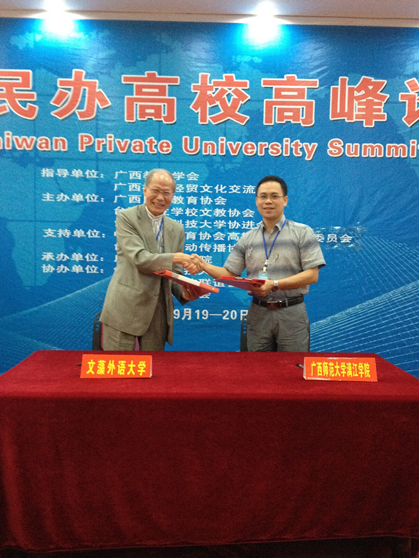本届桂台民办高校高峰论坛取得丰硕成果,计有22对共47所高校签订了合作协议,两岸民办、私立高校结成姊妹学校,成功地为两岸高校合作与交流搭建了一个非常好的平台。我院分别也与台湾建国科技大学、台湾中州科技大学、台湾文藻外语大学三所高校签订了合作协议。
