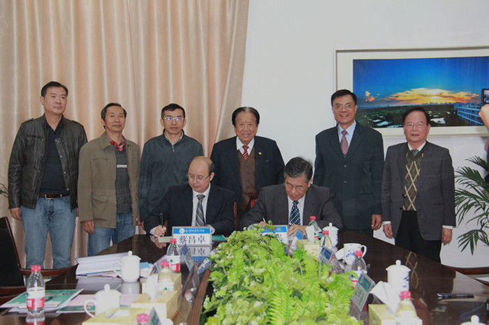 学院院长蔡昌卓(前排,左)与台湾建国科技大学校长陈繁兴(前排,右)签订合作交流协议