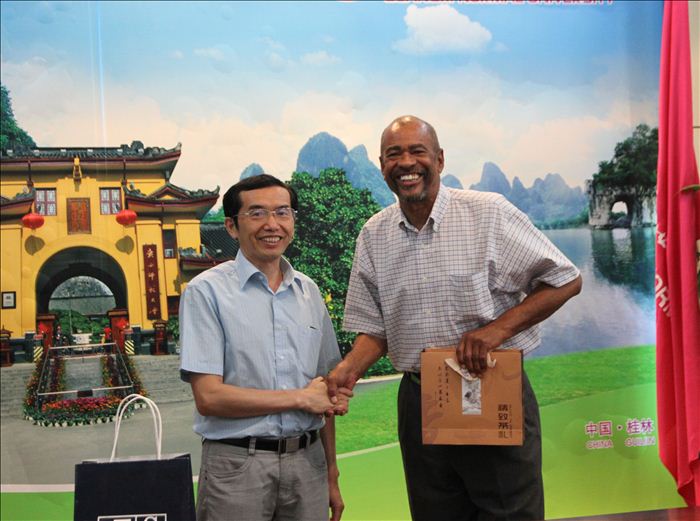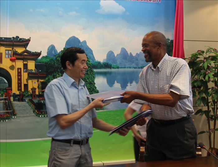 双方首先介绍了各自学校的办学情况,并表达了开展多学科多方位交流与合作的意向。随后,覃卫国、周世中分别代表广西师范大学、漓江学院与美国Jackson State University 签订了合作协议书,主要内容包括:交换生项目、访问学者及管理人员交流、开展教育和研究领域的合作、攻读硕士合作项目等。