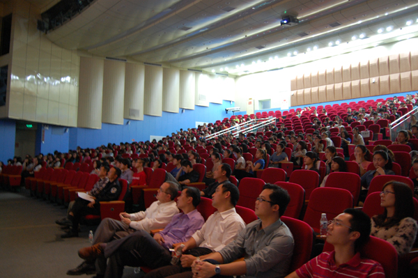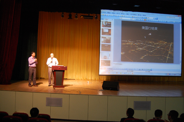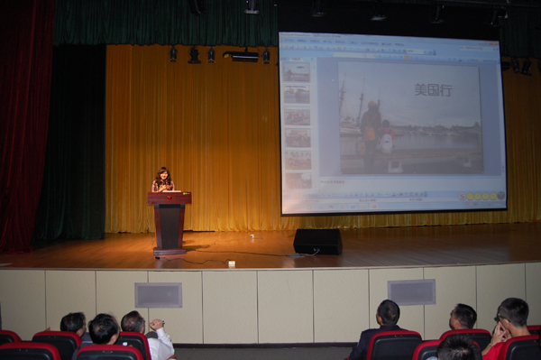 报告会由达拉斯浸会大学专门为本次赴美活动拍摄的全程回顾短片拉开序幕。洪嘉谣首先发言:“CBU坐落于美国洛杉矶河边镇,全校皆墨西哥风格建筑:米白色的墙配朱红色的瓦,高大的棕油树等独具地中海气候风格的植被随处可见,这让人觉得在轻松舒适之余也不失加州火样的热情。他们的教学设备,无论是软件还是硬件都是一流的棒:干净整洁的教学楼,老师丰富有趣的教学方式,特别是他们音乐系的合唱团训练,这从他们合唱团员的声部排列方式上就可以很明显的看得出来中西文化差异,在CBU交流期间,为了宣传中国文化,也为了让更多的美国朋友知道我们的到来,我们开展了一个小小的,具有中国特色的音乐表演。虽然我们生活在不同的地方,但我却知到我们已经有了一段共同的美好回忆,而这份美好的回忆将会跟随我们一生,影响我们一生。”