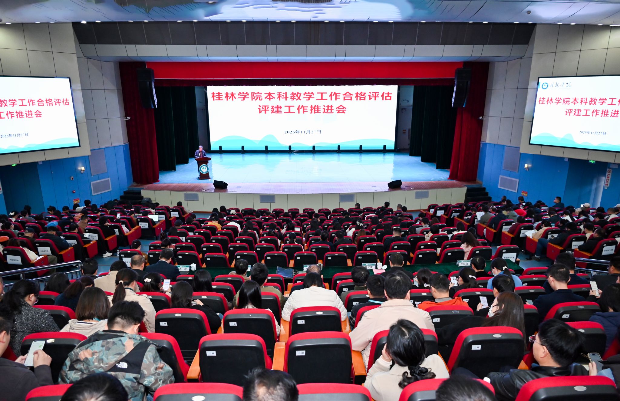 为全面总结本科教学工作合格评估(以下简称 合格评估)近一周年以来的评建工作成效,精准研判当前评建工作中的短板弱项,部署下一阶段攻坚冲刺任务。1127日,学校在弘善讲堂召开本科教学工作合格评估评建工作推进会。在家校领导吴郭泉、康庚连、杨庆庆、蒋毅出席会议,全体首席教授、银龄教师,全体中层管理干部,各二级学院专任教师代表,各职能教辅部门教职工代表参加会议。会议由杨庆庆副校长主持。