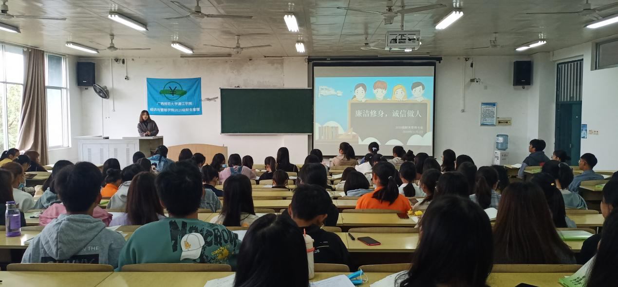 为了培育学生正确的价值观和高尚的道德情操,11月1日晚,经济与管理学院2020级财务管理专业在至善楼1314教室开展了“廉洁修身,诚信做人”主题教育活动,本次活动由赵玲老师主持,全体2020级财务管理新生参加。
