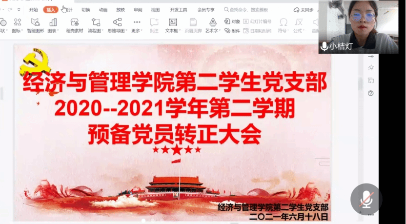 6月18日上午12:10,经济与管理学院第二学生党支部在腾讯会议上组织召开预备党员转正大会,支部全体党员参加会议。经济与管理学院第四学生党支部书记郝环一,第五学生党支部书记谢鹃霞列席会议。
