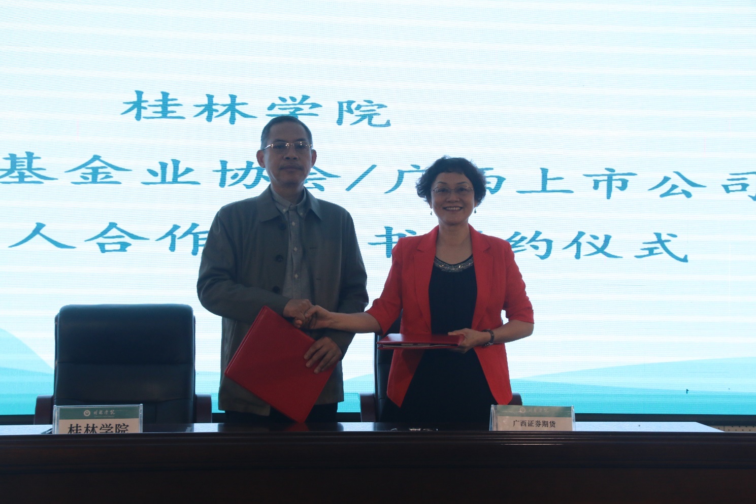 当天,桂林学院与广西证券基金期货业协会、广西上市公司协会分别签署了合作发展协议,并授以桂林学院“金融高素质人才培养基地”、“证券期货基金投资者教育基地”;随后桂林学院也与协会的会员单位东方证券桂林营业部进行了“桂林学院金融产学研合作育人基地”的授牌活动。