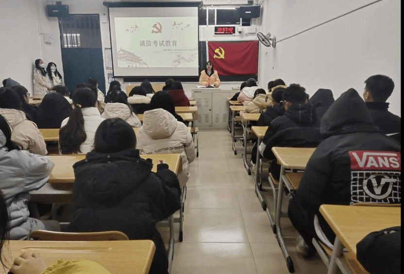 首先,由支部党员郭成敏带领同学们重新学习学生手册关于考试管理制度,讲述了考试作弊的危害性,引导同学们严格遵守校级校规,诚信参加考试,做文明大学生。其次,她给全体同学分享了备考的方法。同学们要制定合理的复习计划,做好时间管理,端正态度,保持积极的备考心态。最后,党员党延伟老师强调,同学们要从自身做起,严于律己,杜绝考试作弊现象的发生,同时预祝同学们在期末考试中取得优异的成绩。