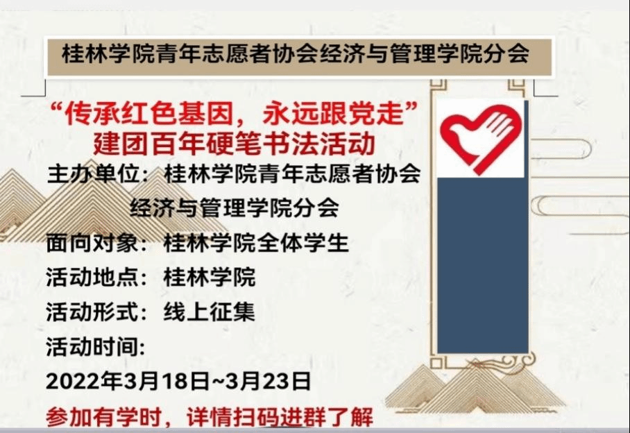 为迎接中国共青团建团一百周年,进一步继承和弘扬伟大的共青团精神,青年志愿者协会经济与管理学院分会于3月18日至3月23日开展以“初心终不忘,以墨书百年”为主题的硬笔书法线上征集活动。