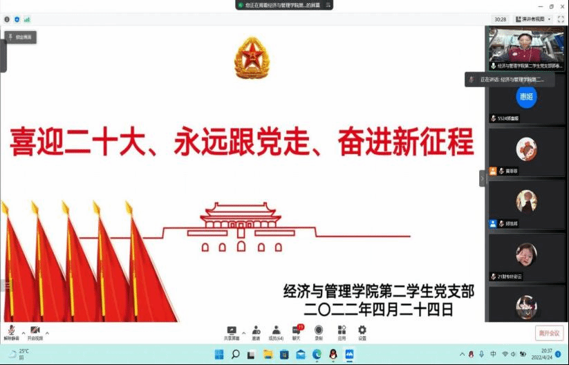 为迎接党的二十大,庆祝共青团建团100周年,培育青年学生的爱党之心、爱国之情。4月24日,经济与管理学院第二学生党支部于在线上开展“喜迎二十大、永远跟党走、奋进新征程”为主题的“党员讲团课”活动。经济与管理学院第二学生党支部书记黄淑娟、党支部党员郭春雨、辅导员党延伟以及2021财务管理专升本团支部全体同学参加活动。