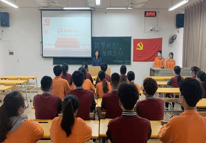 首先,主持人介绍本次活动的背景、目的及意义。接着全体起立,奏唱校歌《造就人才的殿堂》。紧接着,主持人从校史沿革、学校简介、学校发展的基本概况和校训精神这四个方面让同志们重温学校历史,进而赓续磅礴精神伟力。同志们在观看学校发展基本概况的视频时,不禁感慨万分。其中,薛阔同志提到“要珍惜、感谢学校创造的良好学习氛围,同时也要用实际行动回报学校”。