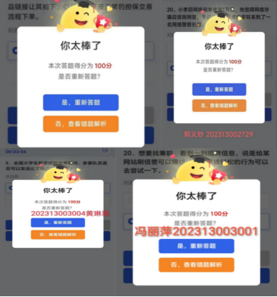 本次活动围绕“全国大学生网络安全知识答题”、学习“大学生网络素养能力提升大课堂”和“网络安全知识学习专区”三个部分逐项展开。各专业各班级积极行动,通过集体学习、讨论学习与个人自学学习各类网络安全典例,提升了各位同学网络安全防范意识意识和网络安全防护能力。其中,大二学生表示现在网络诈骗频繁发生,观看网络安全知识和参加安全知识答题可以增加网络安全知识,以防被骗;大一新生表示,学习网络安全知识不仅有利于我们提高安全知识素养,还有利于我们了解诈骗分子的手段,以防我们掉进诈骗的陷进。