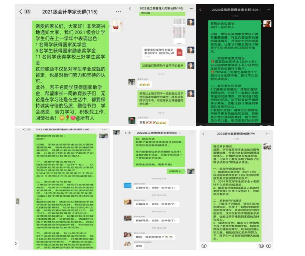 为了加强家校之间的联系,使家长能更全面地了解孩子的在校表现,管理工程学院利用微信群及时通报了学生的获奖情况。这不仅是对学生们努力的认可,也是对他们家庭支持的一种感谢。家长们对学院的做法表示高度赞赏,认为这增强了他们对孩子教育的关注度,并促进了家庭教育与学校教育的有效结合。多位家长在群内表达了对学院工作的感谢,以及对未来继续加强家校合作、共同促进孩子成长的意愿。