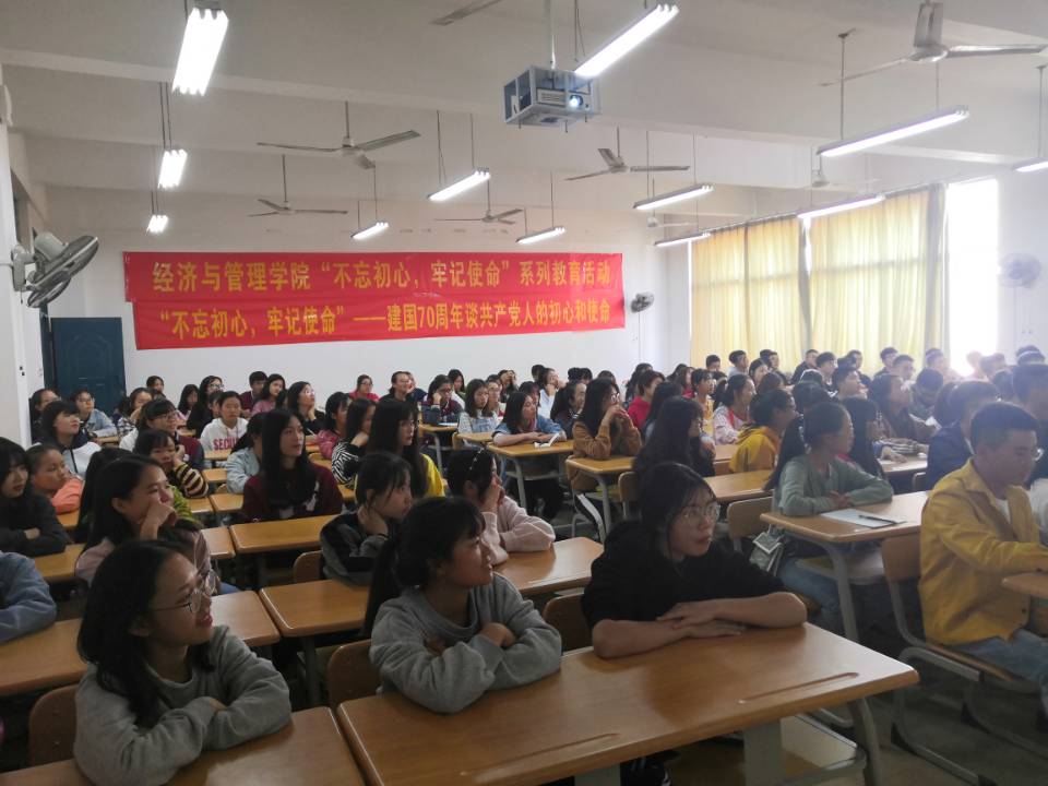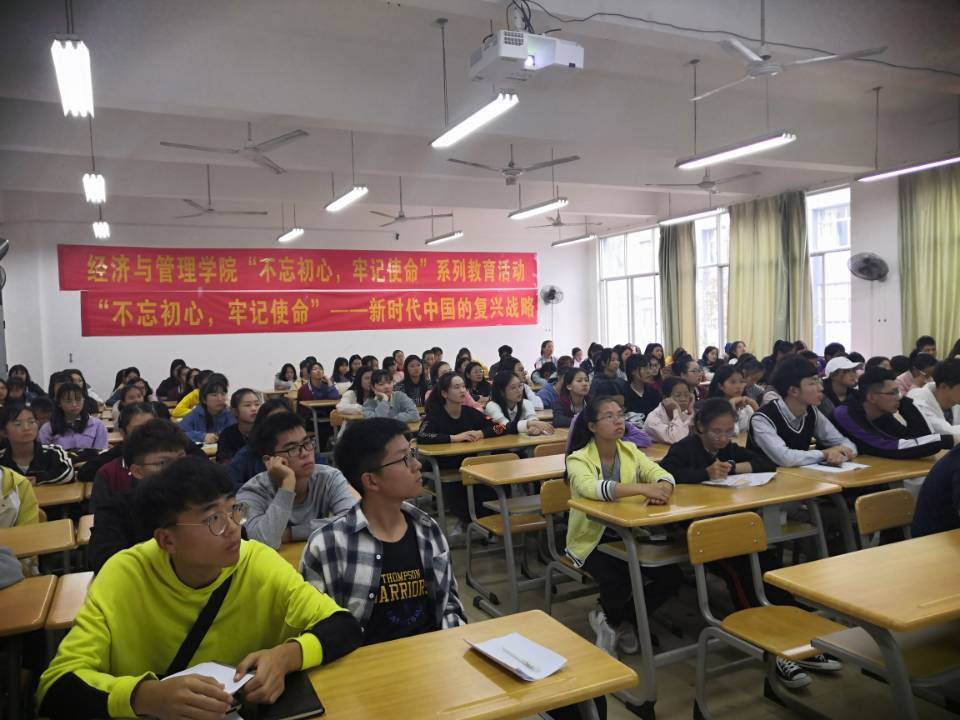 11月9日(周六)上午和下午,11月16日(周六)下午,经管学院邀请了中共桂林市委党校周久贺、王孙旺两位老师分别在1317教室开展了三场关于“不忘初心,牢记使命”主题教育讲座活动。三场讲座均由李志献副院长主持,经济与管理学院韩磊副书记、郑竹青副院长、康旺强、阙菲菲、成雅真等多位教师和2019级经济学、金融学、会计学、财务管理等专业全体同学参加并聆听了讲座。