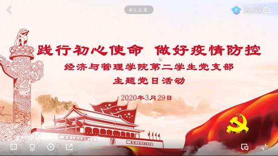 为在打赢疫情防控阻击战中更好地发挥党支部战斗堡垒作用和党员先锋模范作用,教育引导学生党员在疫情防控中践行入党誓言、检验初心使命,经济与管理学院第二学生党支部于3月29日通过腾讯课堂组织开展“践行初心使命,做好疫情防控”主题党日活动,活动由党支部书记谢鹃霞主持。