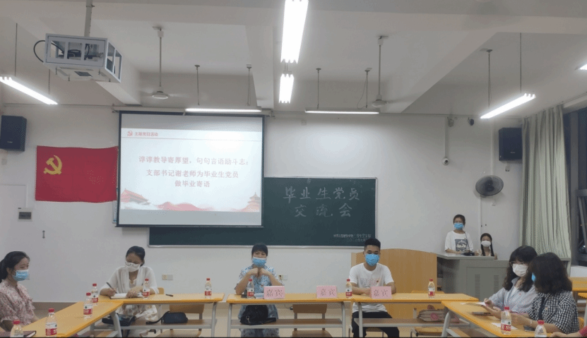 首先,全体党员观看了建党99周年系列视频,回顾中国共产党99年来艰苦奋斗、求实创新、砥砺前行的风雨历程,并送上祝福。会上,毕业生党员纷纷表达毕业感受,分享自己在大学期间,在党组织的培养和教育下,自己从思想、学习和生活方面发生的改变,鞭策自己努力向榜样看齐,向优秀出发,同时也表达了对老师、对母校感恩之情。低年级党员也纷纷送上毕业祝福,表明要向学长学姐看齐,要争当先锋和榜样的决心。随后,党支部为党员送上政治生日贺卡和寄语,一张小小的寄语贺卡,不仅是对党员的激励,更是鞭策,提醒党员时刻牢记党员身份,发挥党员的先锋模范作用。毕业生党员一一做出承诺,在新的工作岗位一定不忘为人民服务的初心,敢于作为,乐于奉献,为母校争光,为党旗添彩。在梁富荣同志的带领下,全体党员在面对党旗,重温入党誓词、 牢记初心与使命。最后,支部书记谢鹃霞老师向毕业生党员送上了祝语:一是祝福党员同志们顺利毕业,人生即将开启新一段征程;二是希望党员同志们不忘来时路,要有感恩的心,牢记老师的教导,学校的教育;三是不忘初心,牢记使命,砥砺前行,在工作岗位上发挥自己的优势,奉献于社会,实现人生价值。