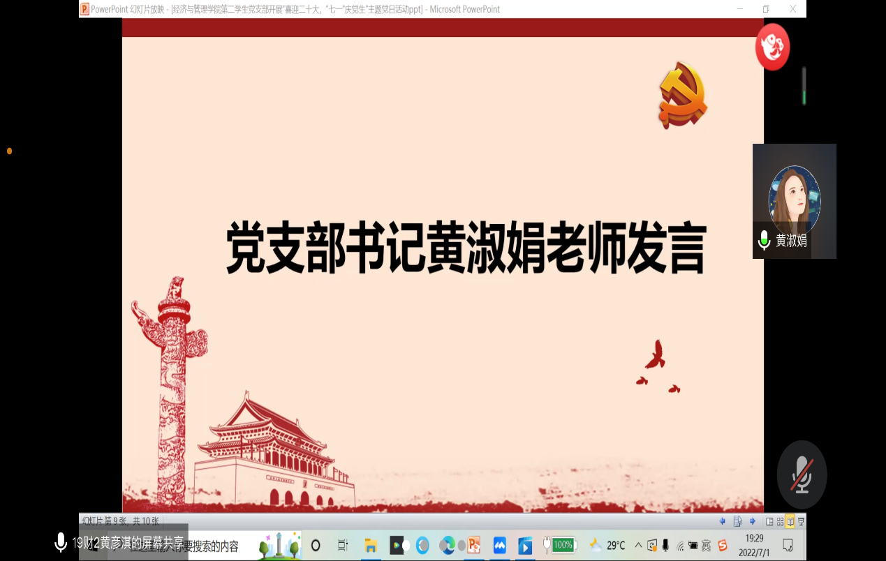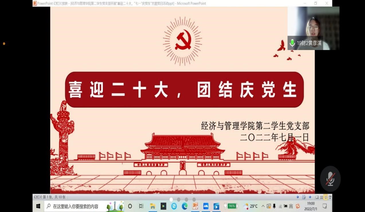 为了庆祝中国共产党成立101周年以及香港回归25周年,进一步加强党员的思想建设、组织建设、文化建设,7月1日晚,经济与管理学院第二学生党支部开展“喜迎二十大 团结庆党生”主题党日活动。党支部书记黄淑娟及全体党支部成员参加此次会议。