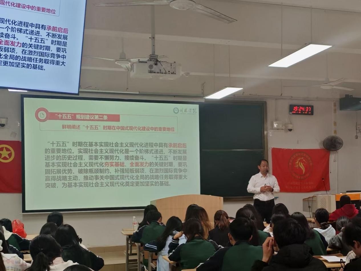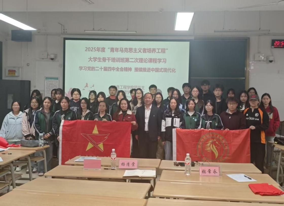 为深入贯彻落实党的二十届四中全会精神,引领青年学子深刻把握中国式现代化的核心要义,筑牢听党话、跟党走的思想根基,11月25日晚,工商管理学院与信息工程学院联合举办2025年度“青年马克思主义者培养工程”(“青马班”)第二次理论课程。马克思主义学院院长、信息工程学院团总支书记杨清棠、工商管理学院团总支书记吴东艳,以及两院“青马班”一百余名学员共同参与学习。
