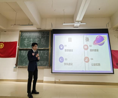 本次大会在奏唱共青团团歌中拉开序幕。首先,由管理工程学院党总支副书记汤靖老师为大会致辞。汤靖老师对团支部未来工作的开展提供了宝贵的意见和指导,同时预祝本次期末考评大会取得圆满的成功。本次大会考评,共有26个团支部参加,各团支部代表依次上台,分别从思想建设,组织建设,学风建设和公益实践四个板块出发,结合专业特色,“至善”的理念和社会热点与时事新闻来展示本学期的建设成果。展示的过程中,2022级旅游管理团支部将所学的专业知识运用到实践中,向大家展示了本学期的收获的成果,展现了团支部成员的多才多艺,并且积极参与各项活动收获了多项荣誉;2023级会计学第二团支部结合了中国的龙的艺术元素,创意新颖,展现了团支部积极进取的精神风貌,团支部成员积极参与本次大会并以最优的状态展现本学期的成果。