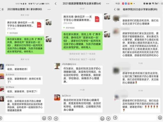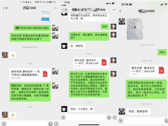 本次活动中,结合学院不同学段育人的具体目标,各年级的家书活动以不同形式召开。通过辅导员将学生心理活动近况及家庭情感交流的方法写成一封信,并且将信件以家长会、Email、家长群发放、重点人群学生家长单独沟通的形式寄送到家长手里,加强家校沟通的同时,帮助学生家长能够了解学生在校心理情况,提升家长对学生心理健康教育的重视程度。学生家长收到信件后纷纷与辅导员进行沟通交流,表示该活动很有意义,让家长们对孩子的认识更加全面,深刻了解到心理健康对于大学生的重要性,将来将会积极关注同学们的心理健康,加强家校沟通,与学校一同为同学们的学习生活保驾护航!