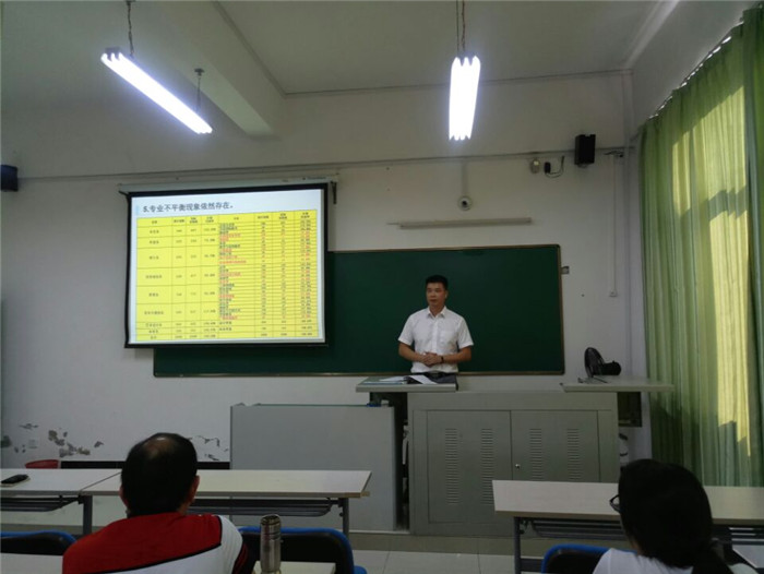 蒋毅首先就我校招生总体情况进行了介绍,并着重对我系的总体情况进行了说明。蒋毅处长介绍到“管理系总体招生情况还不错,但是相对于之前火爆的状态有所减退,系部可以结合招生数据,让系部专业布局和转型发展更为合理和有针对性”。接着,蒋毅处长就招生工作中出现的一些具体问题进行了说明,并希望全校教职工关注和支持招生工作,让学校的未来更加可持续性的进行发展!