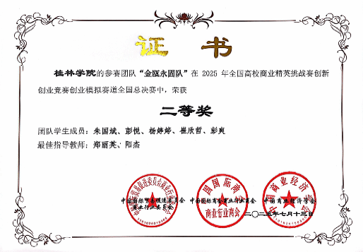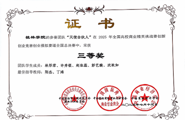 7月12日,桂林学院工商管理学院组织学生参加了2025年全国高校商业精英挑战赛创新创业竞赛创业模拟赛道全国总决赛。经过前期校内赛、区域赛的严格选拔,最终4支优秀队伍(金瓯永固队、梦想队、天使合伙人队、婀娜祥媛队)共20名同学代表学院参加了此次全国总决赛,郑丽英、阳杰、丁鸿、吴萍、陈晓华老师指导比赛。