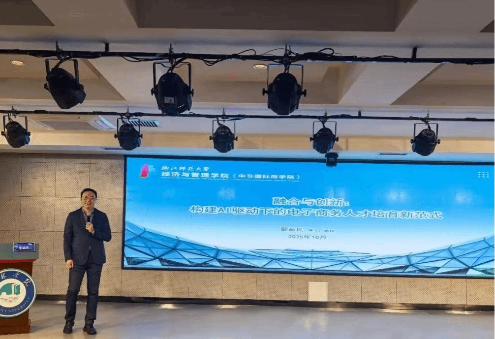 随后,浙江师范大学电子商务研究与发展中心主任邹益民教授作《融合与创新:构建AI驱动下的电子商务人才培育新范式》专题报告。邹益民教授回顾了电商人才培养从“互联网+”阶段到“人工智能+”阶段的演进路径,提出高校的人才培养正加速从传统知识型培养走向智能化、复合型、实践导向的人才培养体系。他围绕“新角色定位、新教学范式、新评价体系、新课程体系、新教学模式”提出了“五个更新”,并重点介绍了以“场景化、数据化、智能化”为特征的实践教学3.0体系,该体系通过政产学研用协同,推动AI工具包开发、师资赋能培训、学生竞赛贯通实践教学,旨在加快形成“懂业务、懂技术、懂规则”的新型电商人才培养路径。