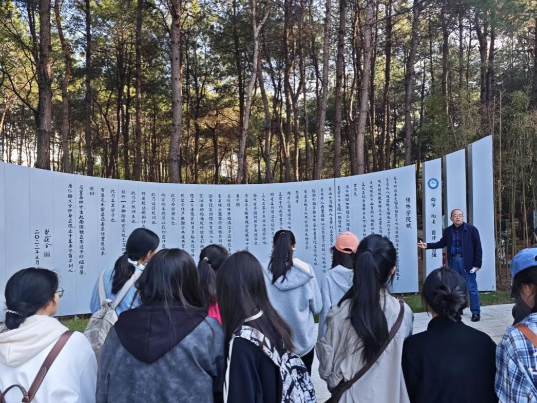 为引导2025级新生深入了解学校办学历史与文化底蕴,增强知校、爱校、荣校情怀,11月23日下午,工商管理学院组织2025级各专业新生代表前往至善林《桂林学院赋》碑刻处开展实地参观学习。活动特邀教育与音乐学院党总支书记周杰现场讲解。