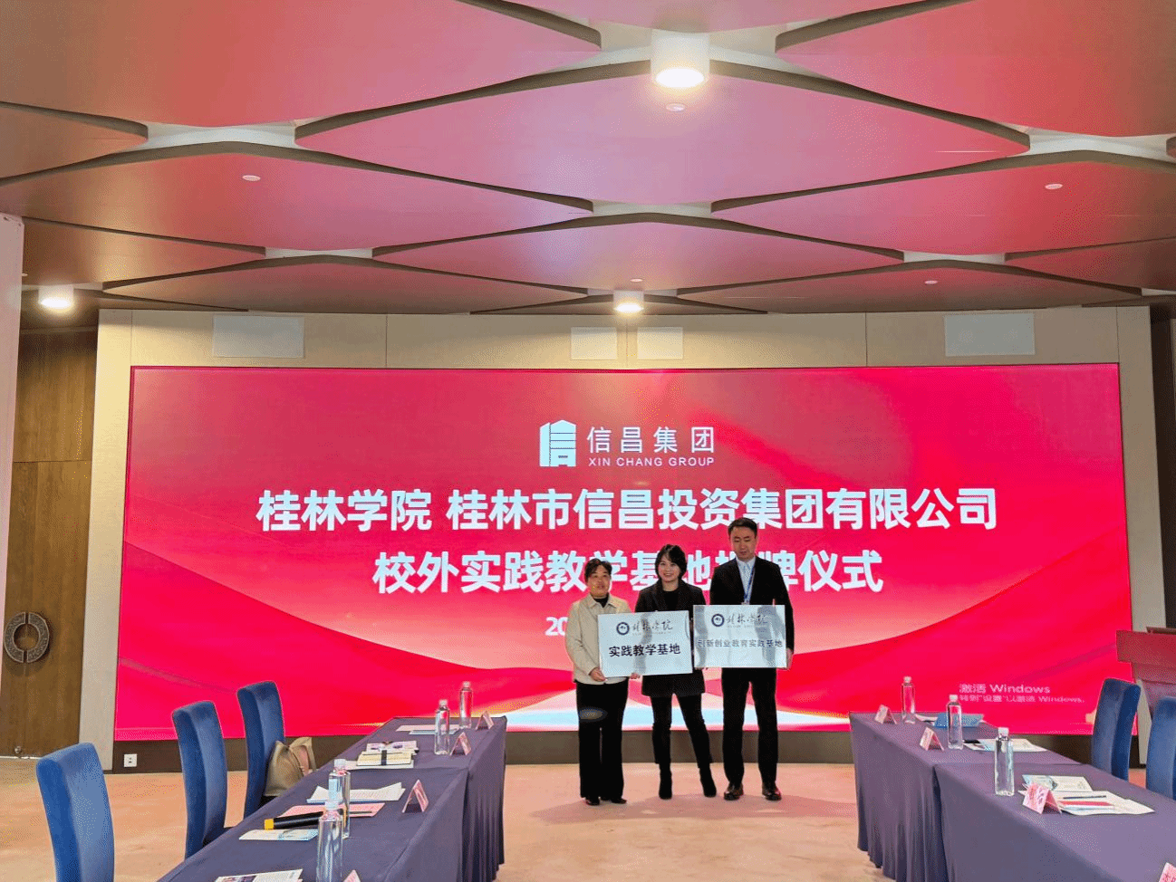 为进一步深化产教融合,创新人才培养模式,拓宽学生实习和就业渠道,3月19日,我校与桂林信昌投资集团有限公司共建校外实践基地签约暨揭牌仪式在信昌桂海晴岚隆重举行,桂林学院副校长何玲、工商管理学院党总支书记、副院长、学院教师代表出席此次活动。信昌集团副总经理、晴岚酒店总经理兼大碧头房务总监、桂海旅游营销部经理、桂海餐饮部餐厅经理和集团人力资源部招聘负责人等企业高层共同出席了此次仪式。