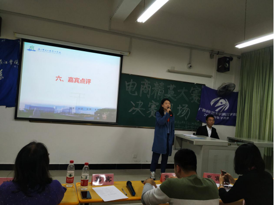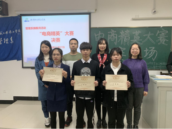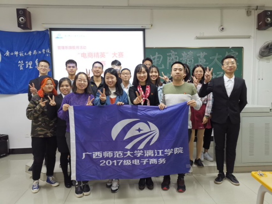 2018年11月27日晚18:30,由管理系主办,2017级电子商务专业承办的旗舰月活动“电商精英”大赛决赛在3406教室举行。本次决赛邀请到的评审嘉宾有5人,他们分别是:广西师范大学漓江学院管理系党总支副书记韩磊老师、专任教师王倞老师、刘方舟老师、电子商务专业辅导员王海玲老师和王彦文老师。