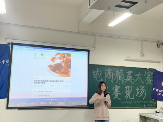 经过初赛、复赛的层层选拔,共有十个小组脱颖而出,晋级决赛。决赛包括淘宝详情页展示、营销思路解说和现场问答三个环节。淘宝详情页展示了各小组上传到淘宝后台的1个广西特产,包括产品标题、产品属性、图片、规格、电脑端描述等几个部分。营销思路解说由各小组代表从营销思路、营销渠道、组员分工、销售成绩等几个方面展开陈述。最后由评审嘉宾进行现场提问。