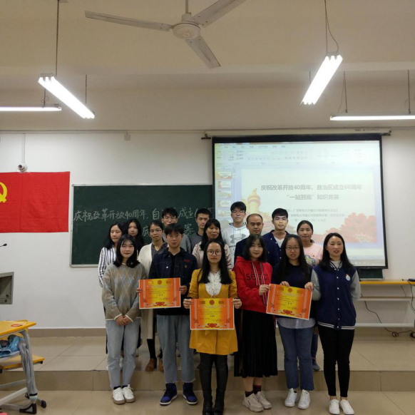通过此次知识竞赛,积极引导我系大学生党员关注党情国情区情的发展,紧跟时代步伐,让党员们对改革开放40年和自治区成立60年来取得的伟大成果有了更深的认识,更加坚定在中国共产党的领导下,国家的发展和壮乡人民的生活会越来越好。同时,也促进了各个学生支部的学习交流,增强了各个学生支部的生命力、凝聚力和战斗力。