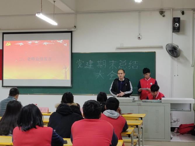 随后, 由各学生党支部代表对本学期支部的党建工作进行总结。 第一学生党支部代表方良睿认为,加强党员队伍建设应从基层抓起,要激发党员的积极性,不断完善党员的思想道德建设。第二学生党支部代表梁富荣表示,党员之间应加强沟通交流,要规范党员的日常行为准则,增强党支部凝聚力,有利于党支部建设。